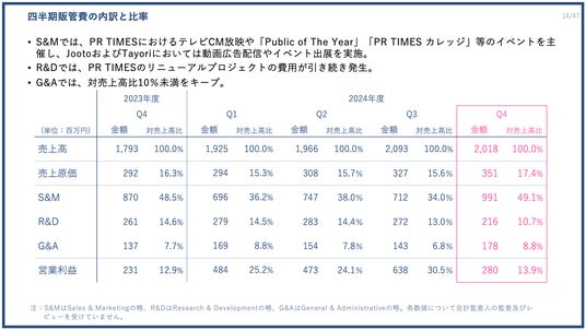 S&Mは、PR TIMESにおけるテレビCM放映や「Public of The Year」「PR TIMESカレッジ」等のイベントを主催、JootoおよびTayoriにおいては動画広告配信やイベント出展を実施し、売上高比率49.1%となりました。R&Dでは、PR TIMESのリニューアルプロジェクトの費用が引き続き発生し、売上高比率10.7%となりました。G&Aは売上高比率8.8%と10%未満をキープしています。