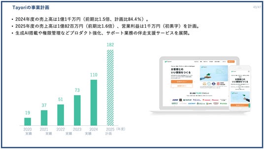 Tayoriの事業計画について、2024年度の売上高は1億1000万円(前期比1.5倍、計画比84.4%)となりました。
