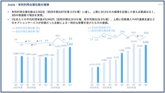 2025年2月末時点の有料利用企業社数は2562社に達し、前四半期比で87社増加いたしました。上期に34.6%もの大幅増を記録した後も反動減はなく、これで3四半期連続の増加となります。1社あたりの平均利用単価は9945円となり、前四半期比で10.6%増加いたしました。上期には初期導入やAPI連携支援などのオプションサービスが好調だった反動による一時的な影響を受けたものの、今四半期には持ち直し、堅調に推移しています。