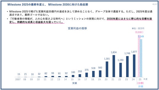 Milestone 2025で掲げた営業利益35億円の達成を決して諦めることなく、グループ全体で邁進してまいります。ただし、2025年度は通過点であり、最終ゴールではありません。