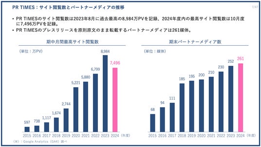 「PR TIMES」のサイトの閲覧数は、2023年8月に過去最高の8984万ページビューを記録しました。PR TIMESの2024年度内の最高サイト閲覧数は、10月に月間7496万ページビューを記録しています。また、「PR TIMES」で配信するプレスリリースを転載いただくパートナーメディアの数は、前期比9媒体増の261媒体と、パートナーを順調に広げています。
