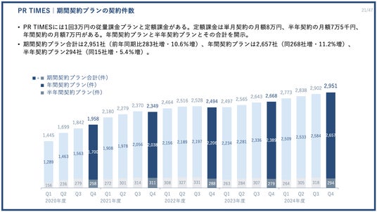 「PR TIMES」には1回3万円の従量課金プランと定額課金のプランがあり、定額課金は単月契約の月額8万円、半年契約の月額7万5000円、年間契約の月額7万円に分かれています。年間契約プランと半年契約プランとその合計を四半期で開示します。