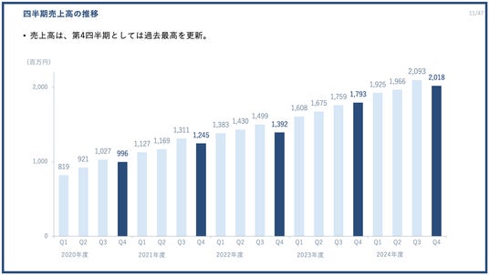 四半期売上高の推移では、堅調に成長基調を継続しているのがご確認いただけます。四半期売上高は、第4四半期としては過去最高を更新しました。