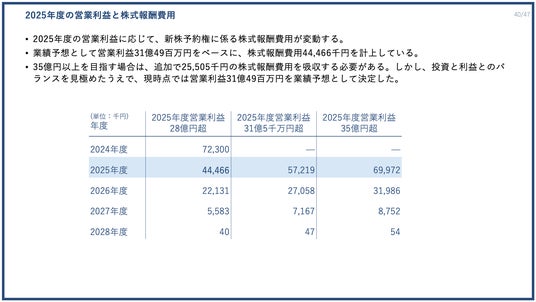 続いて、2025年度の営業利益と株式報酬費用についてです。2025年度の営業利益に応じて、新株予約権に係る株式報酬費用が変動しますが、業績予想として営業利益31億4900万円をベースに、株式報酬費用4446万6000円を計上しています。35億円以上を目指す場合は、追加で2550万5000円の株式報酬費用を吸収する必要がありますが、投資と利益とのバランスを見極めたうえで、現時点では営業利益31億4900万円を業績予想として決定しました。