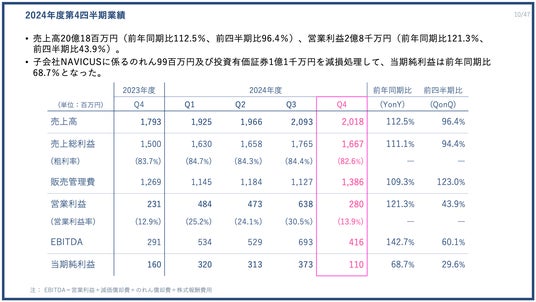 2024年度第4四半期の業績は、売上高が20億1800万円、営業利益が2億8000万円、当期純利益が1億1000万円となりました。前年同期比では、売上高が112.5%、営業利益が121.3%と堅調に推移したものの、あわせて2億円以上の減損処理を行った結果、当期純利益は前年同期比68.7%となりました。
