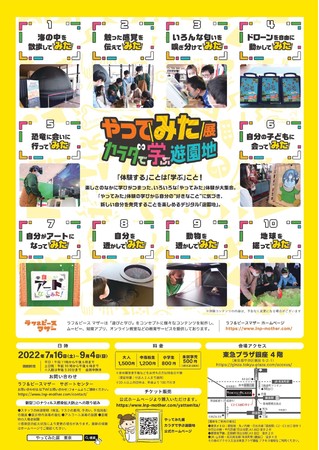 「やってみた展~カラダで学ぶ遊園地~」は体験することは学ぶことをテーマとして、楽しさのなかに学びがつまった、子供たち、中高校生から大人まで興味・関心を広げるきっかけとなる多種多様な「やってみた」体験コンテンツを用意しています。