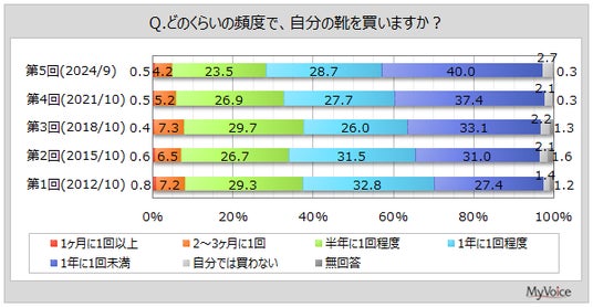 靴を買う頻度は、「1年に1回未満」がボリュームゾーンです。