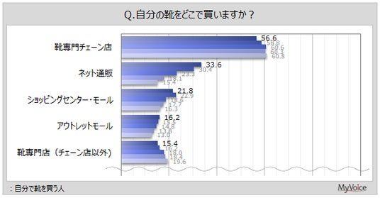 靴の購入場所は(複数回答)、「靴専門チェーン店」が靴購入者の56.6%、「ネット通販」が33.6%、「ショッピングセンター・モール」が21.8%となっています。