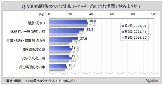 直近1年間にペットボトルコーヒーを飲んだ人の飲用場面は(複数回答)、「間食・おやつ」「休憩時、一息つきたい時」が各30%台、「仕事・勉強・家事をしながら」が27.6%です。