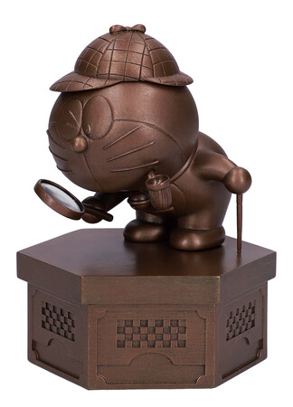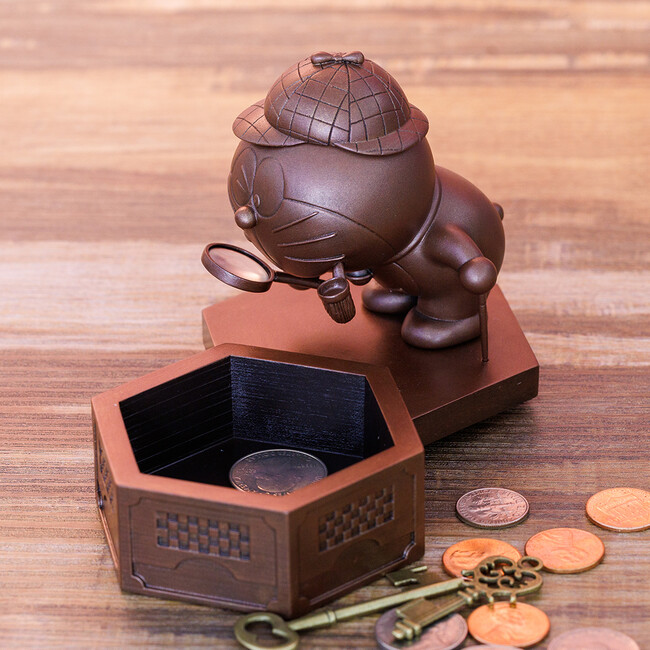 ひみつ道具「シャーロック・ホームズセット」を身につけたブロンズ像風のドラえもんを蓋部分に立体化し、フィギュアとして飾れる他、コインや鍵などを入れる小物入れとしてもお使いいただけます。
