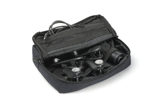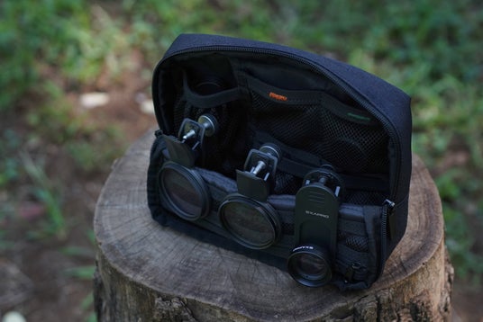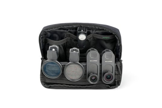 EXAPROシリーズのクリップレンズやフィルタークリップ、マグネティックモバイルスタンドなどを同時に収納可能。クリップレンズは、ポーチ内部のゴムバンドに引っ掛けることで、移動時も安定して収納できます。