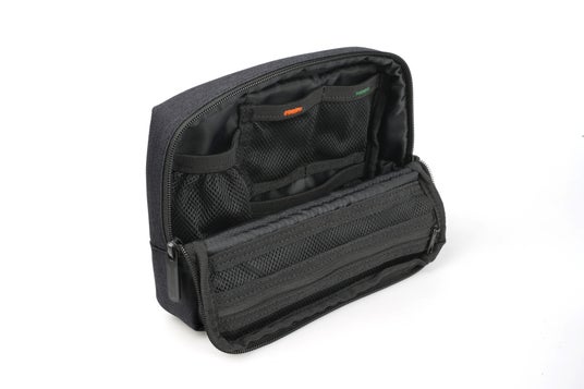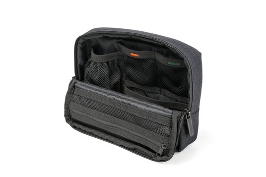 内部には細かな仕切りやネットポケット、ゴムバンドを配置。収納するアイテムに合わせてレイアウトを自由に調整でき、機材をすっきりと整理できます。シーンを選ばず使いやすい、シンプルですっきりとしたデザインも特長です。