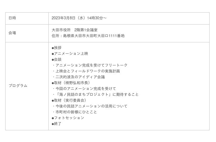 表敬訪問:2023年3月8日(水)14時30分~@大田市役所 2階第1会議室 上映会フィールドワーク: 同日 10時15分~12時20分 @大田市立温泉津小学校