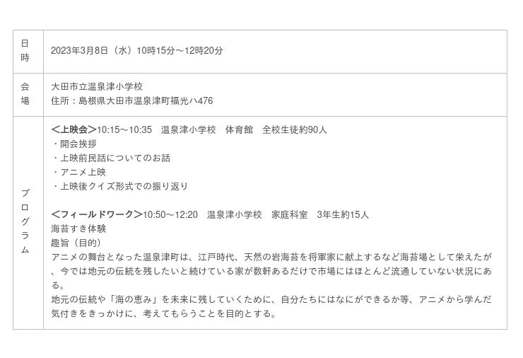アニメの舞台となった温泉津は、かつて「殿島のり」の産地として栄えたが、今では地元の伝統を残したいと続けている家が4軒あるだけで、市場にはほとんど流通していない状況にある。地元で海苔を獲り続けている講師による「海苔すき体験」を実施し、改めて地元の伝統や海の恵みを未来に残していくための大切さを、本体験を通じ感じてもらうことができた。