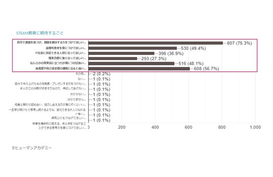 - STEAM教育に期待することで、最も多いのは「課題解決力」。次いで「自己肯定感や論理的思考力」など。