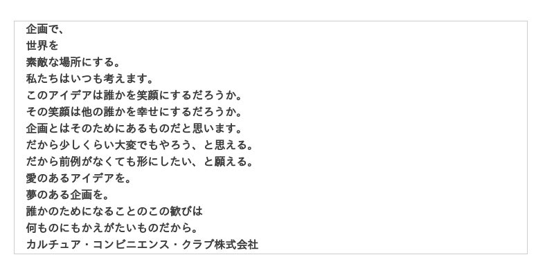 CCCのビジョンは「世界一の企画会社」です。私たちが考える「企画」とは、ライフスタイルに革命をもたらし、新しいライフスタイルを提案していくインフラやプラットフォームのことです。多くの方々の誰もが自然に取り入れられる仕組みを創り続けることを目指しています。こうした私たちの原点にあるのが、江戸時代に活躍したプロデューサー・蔦屋重三郎の存在です。「TSUTAYA」という名前には、彼の挑戦心と独創性への敬意が込められています。私たちは蔦屋重三郎の精神を受け継ぎ、社員一人ひとりが彼のようなプロデューサーとして、文化を未来へと伝える企画を創造していくことを目指しています。そして、その想いをより多くの皆さまにお伝えするため、ブランドムービー( https://youtu.be/HK2VzfZM8QE )を制作いたしました。