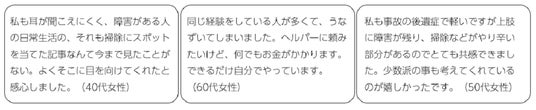 ●障害がある人に目が向いたことがうれしい障害のある方からは、自分たちの日常が話題になったことを前向きに受け止める声がありました。少数派である障害者を対象とした記事が少ないためか、自分たちを取り上げ、しかも掃除という日常に目を向けてくれたことが嬉しかったとのことでした。また、「困っているのは自分だけじゃない」「障害が違うと掃除で困ることも違う」など、気付きもいろいろあったようです。