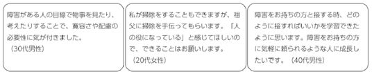 ●接し方や声のかけ方のヒントになった読者の中には、身近にいる家族や同僚などの障害がある人を思い浮かべた人たちもいました。普段、私たちは無意識のうちに障害の「ある」「なし」で線引きをし、立場を固定して考えがちなのかもしれませんが、人によって状況は千差万別。「思いを聞きつつ、頼ってもらう部分と任せる部分を一緒に考えたい」など、接し方を考えるヒントにもなっていました。