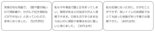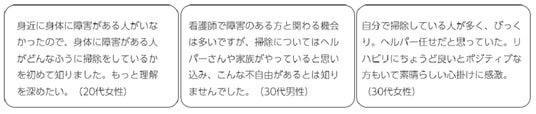 ●障害がある人の日常を初めて知ったまず多かったのは、身体に障害がある人が掃除を自分自身で行っていることへの驚きの声でした。街中で身体に障害がある人を見かけることはあっても、普段の生活を見る機会があまりないためか、自分で掃除をしているという事実、そのための工夫や掃除への思いなどに初めて触れた人が多かったようです。
