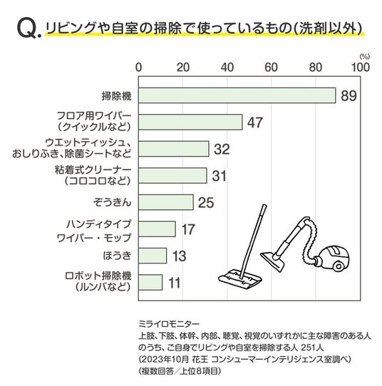 My Kao「くらしラボ」 https://my.kao-kirei.com/kurashi-labo/ 参考) My Kaoくらしラボ 「身体に障害がある人 327人の声 リビングや自分の部屋の掃除、どうしてる?」