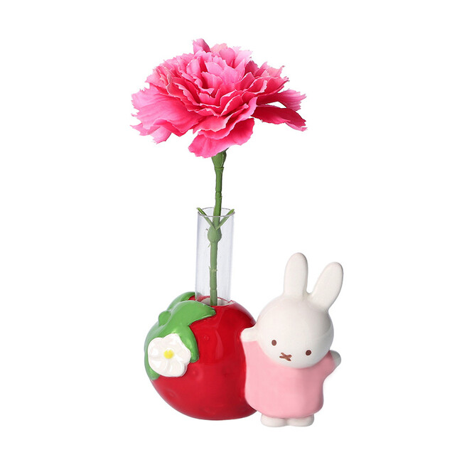おおきないちごの側で、手を上げているミッフィーがかわいらしい陶器の一輪挿しと、カーネーションとガーベラのアートフラワー2本のセットです。ミッフィーがまるで、大きないちごにびっくりしているようなデザインの一輪挿しは、高さ8cmほどの手のひらサイズでデスクやキッチンなどお部屋のインテリアとしてもお楽しみいただけます。ガラス管は取り外し可能で、ペン立てとしてもお使いいただけます。