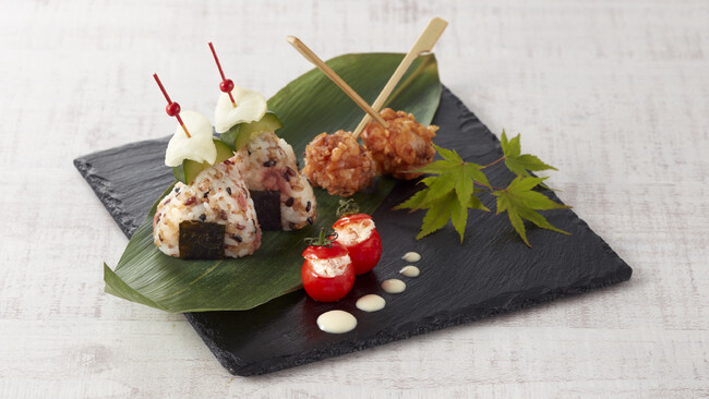 キヌアとカリカリ梅の小さなおむすび、柿の種をまとったチキン、カニサラダ入りトマトファルシ