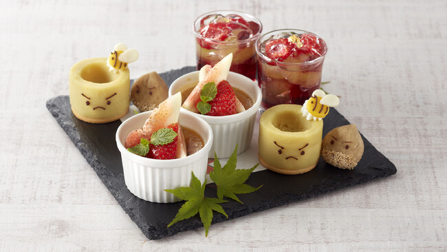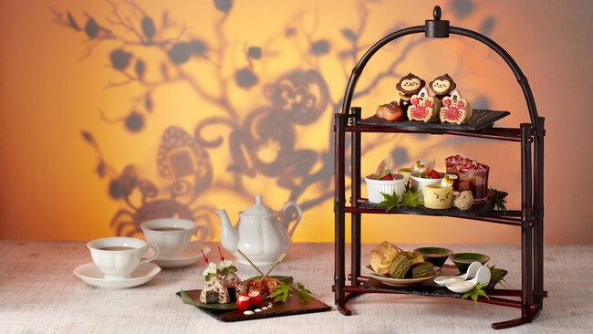 第5弾となる今回は「さるかに合戦」をテーマに、猿のチョコレートムース、カニのクッキーとマカロンなどのスイーツを並べ、物語の世界観を表現しています。また、メニューには埼玉県産のほうじ茶や抹茶、川越の名産品であるさつま芋など秋の味覚も使用しております。絵本をイメージしたイラストとお話し入りのメニューブックを手に取りながら視覚と味覚で楽しめるアフタヌーンティーに仕上げました。