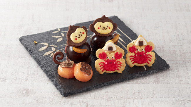 "猿"のチョコレートムース、"カニ"のクッキーとマカロン、"臼"のスイートポテト、