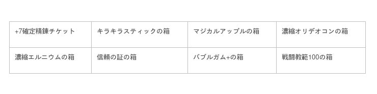 精錬可能な装備アイテムの精錬値を「+7」まで上昇させてくれる「+7確定精錬チケット」をはじめ、獲得経験値が増加する「戦闘教範100」やステータスリセットができる「マジカルアップル」など、お役立ちアイテムが揃っています。ぜひお買い求めください!