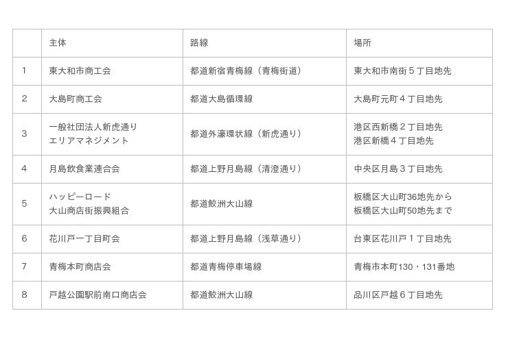 東京都では、新型コロナウイルス感染症の影響を受ける飲食店等の皆様を支援するための緊急措置として、都道及び臨港道路において、地方公共団体と地域住民・団体等が一体となって取り組む沿道飲食店等の路上利用の占用許可基準を緩和しております。