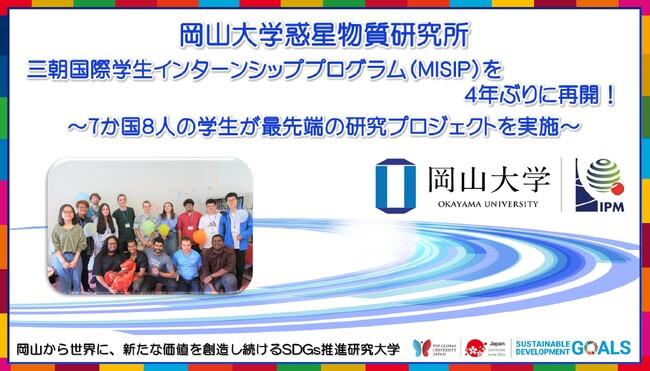 国立大学法人岡山大学(本部:岡山市北区、学長:那須保友)惑星物質研究所(鳥取県三朝町)では、2023年7月4日から「三朝国際学生インターンシッププログラム(MISIP;Misasa International Student Internship Program)」を開始しました。