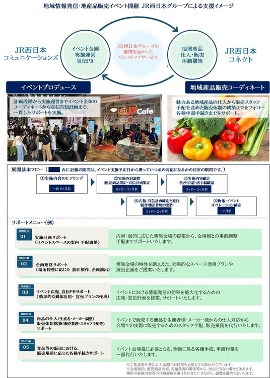JR西日本グループは、駅ナカ催事スペースの情報発信力を生かし、地域の皆さまとともに地域魅力の発信、地域活性化に貢献しています。このたび、西日本旅客鉄道株式会社、株式会社JR西日本コミュニケーションズ、株式会社JR西日本コネクト(※)の3社が連携し、イベントの企画や地産品の仕入・物流の調整、及び販売員の確保などを一気通貫で支援する「ワンストップサービス」を開始することとなりましたのでお知らせいたします。これまでは情報発信者にて調整が必要であった各種準備の負担が抑えられ、より簡易でお手軽にイベントが実施できるようになります。当社グループの駅スペースで、地域の魅力を発信してみませんか。