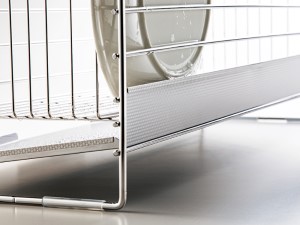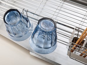 水受けトレー後方の折り返しを上向きに、かつ長くすることで水切りかごの後ろ部分への水漏れをガード。お皿を置く際に、後方に水が漏れにくく、水滴を拭き取る頻度も減りお掃除がラクです。また、両サイドのワイヤーがお皿などの食器を支える設計にし、水滴が付いた皿をしっかりホールドすることで、不快な水の飛び散りを防ぎます。