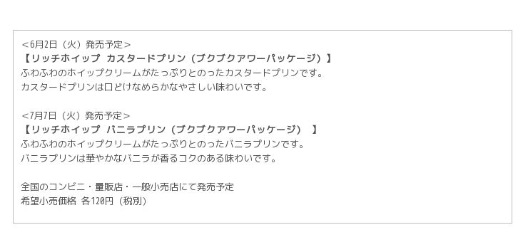 泡の妖精「ブクブクアワー」たちがカワイイパッケージになった「リッチホイップ カスタードプリン」を6月2日(火)より、「リッチホイップ バニラプリン」を7月7日(火)より期間限定で新発売。