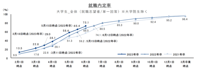 就職内定率は73.1%で、2017年卒以降最高。6月の活動予定から、今後も内定取得が進むことが見込まれる