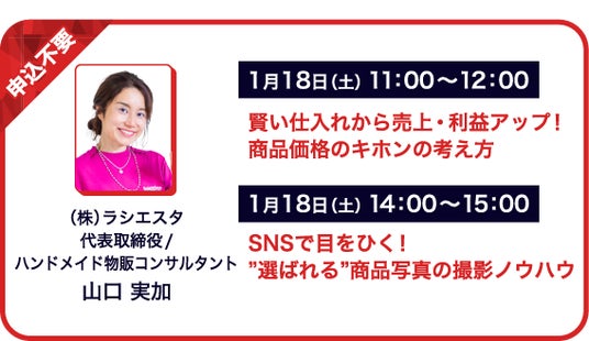 近年、来場者数が増加しているのがハンドメイド作家や美容サロン経営者、インフルエンサーです。本展では最終日である1月18日[土]に、ハンドメイド作家向けのセミナーを開催。商品価格の設定や商品写真の撮影方法にお悩みの方、売上アップを目指している方に、ぜひ受講をお勧めいたします。講師は、自身もハンドメイドで月商100万円以上の売上げに成功し、ハンドメイド物販コンサルタントとして延べ1,000人以上のスキル啓発をしてきた山口 実加氏。本セミナーは事前申込不要となっているので、参加を希望する方はスケジュールの確保を推奨します。