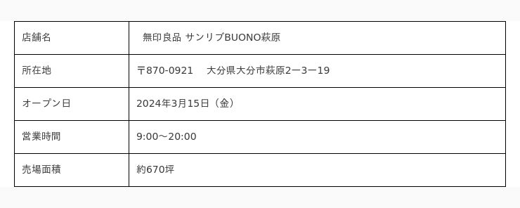 無印良品を展開する株式会社良品計画(東京都文京区/代表取締役社長 堂前 宣夫)は、大分県 大分市に、「無印良品 サンリブBUONO萩原」を3月15日(金)にオープンします。これまで出店している大分県内の店舗は300坪以下でしたが、県内で4店舗目となる当店は売場面積が約670坪で、県内最大です。
