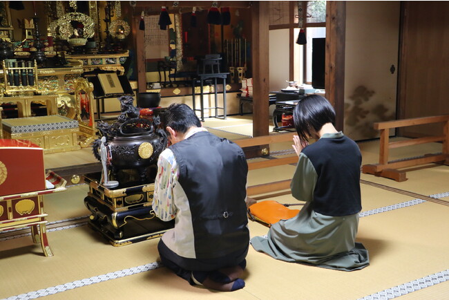 お寺の中は「わびさび」の世界をイメージした、座敷がそのまま御堂となる独特の造りとなっています。さらに、創建400年の歴史と共に歩んできた阿弥陀如来立像を拝観します。