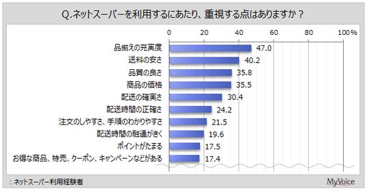 ネットスーパー利用経験者の重視点は(複数回答)、「品揃えの充実度」が47.0%、「送料の安さ」が40.2%、「品質の良さ」「商品の価格」「配送の確実さ」が各30%台です。