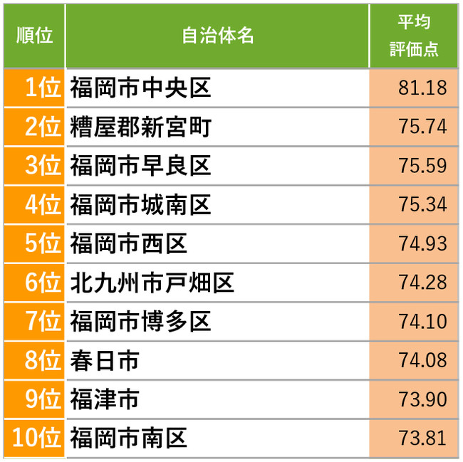 <自治体>では「福岡市中央区」が1位 <駅>では「薬院大通」が1位