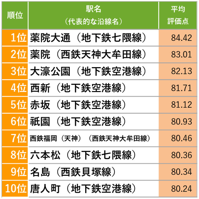 TOP10にランクインしたのは全て福岡市内の駅。そのうち7駅が、福岡市中央区所在。中心繁華街および、地下鉄空港線沿線の、交通・商業の利便性がともに高い駅が上位となった。