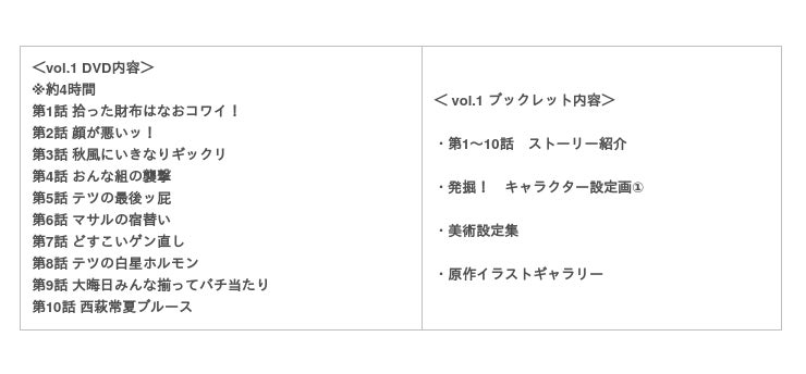 DVDは各巻約10話で毎号4時間を収録し、保存版のブックレットでは各ストーリー&キャラ設定画を紹介。他にも美術設定など貴重な資料も掲載し、今なお高い人気を誇るこの名作アニメのDVDと、その魅力を解説したブックレットをセットでお届けします。
