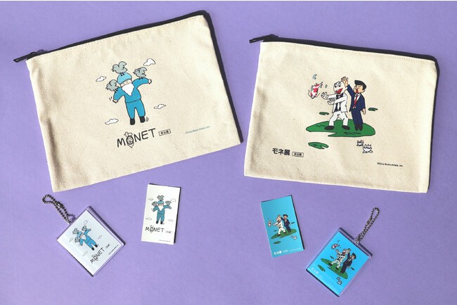 本展の重要なモティーフである〈睡蓮〉の池をのぞき込む「錦鯉」のおふたり(錦鯉・長谷川さん画/右)に、ハトと戯れるモネ(やす子さん画/左)。モネや出品作から着想を得て、おふたりが描いてくれた、ゆるくてキュートなイラストが、まさかのグッズ化。イラストをあしらったアクリルキーホルダーやポーチ、ステッカーを、展覧会会場で販売予定です。