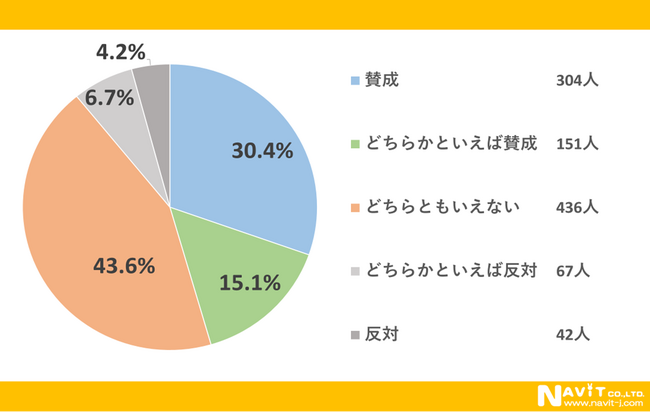 共同親権の賛否について尋ねたアンケートでは、「どちらとも言えない」が一番多く43.6%という結果になりました。続いて「賛成」が30.4%、「どちらかといえば賛成」が15.1%という結果になりました。