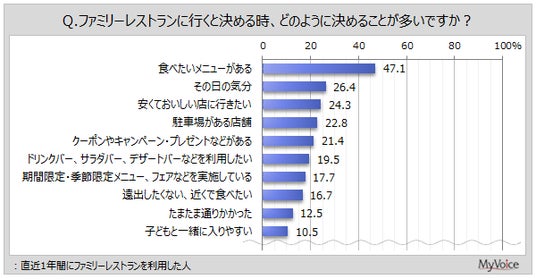 直近1年間にファミリーレストランを利用した人に、ファミリーレストランに行くと決める基準・経緯を聞きました(複数回答)。