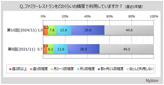 マイボイスコム株式会社(東京都千代田区、代表取締役社長:高井和久)は、10回目となる『ファミリーレストランの利用』に関するインターネット調査を2024年11月1日~7日に実施しました。