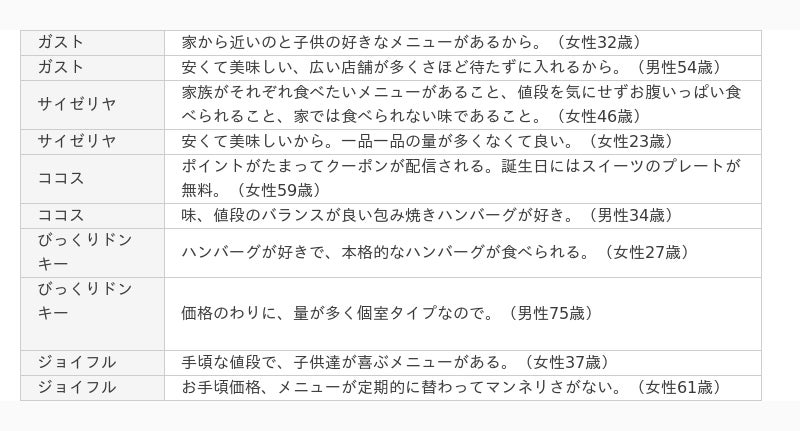 ファミリーレストラン利用者に、最もおいしいと思うファミリーレストランを聞きました。