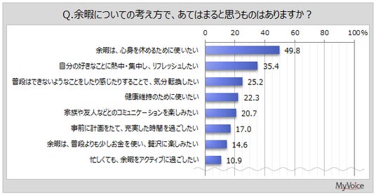 「余暇は、心身を休めるために使いたい」が49.8%、「自分の好きなことに熱中・集中し、リフレッシュしたい」が35.4%、「普段はできないようなことをしたり感じたりすることで、気分転換したい」が25.2%です。