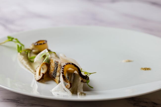 メイン料理のひとつ、『プランチャでミ・キュイに焼き上げた瀬戸内のブランドサワラ “サワライダー” 甘酸っぱいしいたけと蓮根のエマンセ』は、熟成させた旬の寒鰆をレアに焼き上げ、焼き茄子のさっぱりとしたソースで味わう1品です。 “サワライダー”の鮮度や質の高さ、味に惚れ込んだシェフ 春田がその美味しさを最大限に引き出しました。