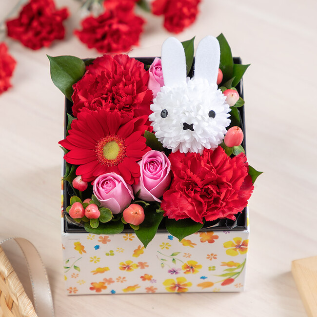 アートフラワー(※注1)の白いピンポンマムでできた“ミッフィーマム”と、生花の赤色のカーネーションやガーベラをフラワーミッフィーオリジナルのボックスに詰めたアレンジメントです。ボックス入りなので飾りやすく、付属の“ミッフィーマム”も長く楽しめます。